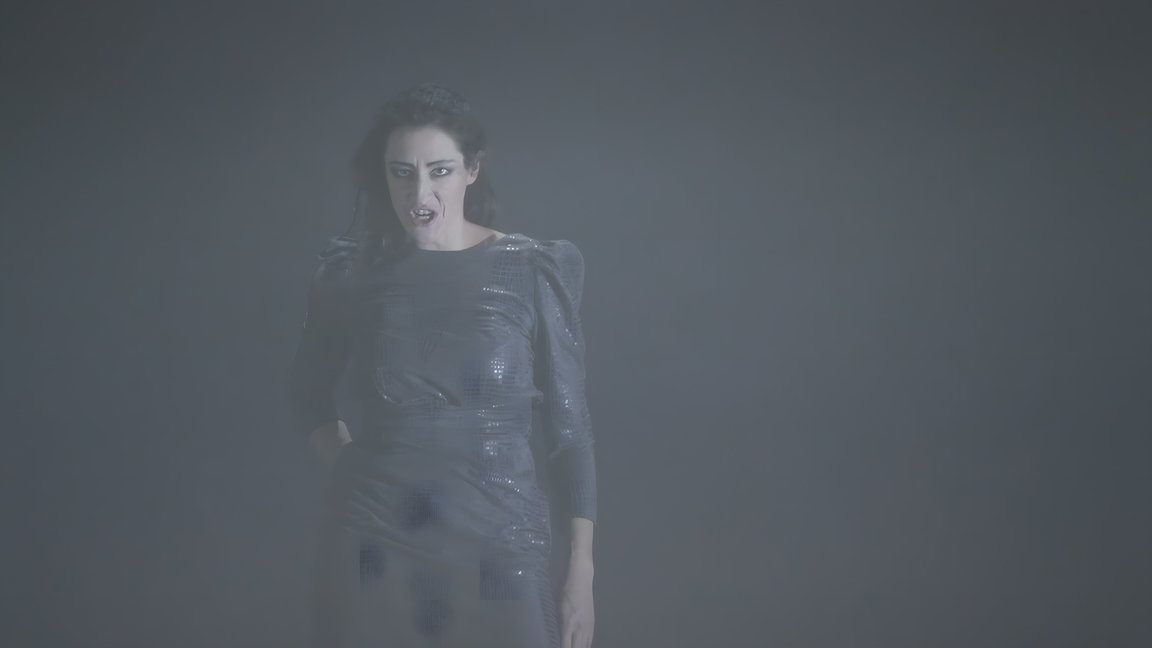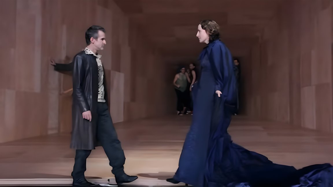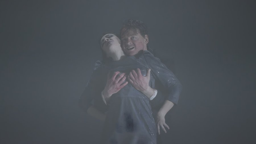 Леди Макбет почти не делает резких движений. Её тело — зажатое, напряжённое, словно под внутренним давлением. Жесты короткие, минимальные, мимика сдержанная. Даже в момент подстрекательства к убийству голос звучит не агрессивно, а скорее отстранённо. В этом трактовании опасность кроется не в ярости, а в молчаливом бездействии и отрешённости.