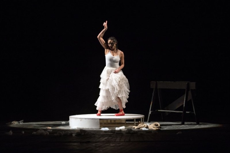 Леди Макбет здесь говорит телом. Её язык — нервные движения, дрожь, потерянный взгляд. Это не пластическая выразительность, а распад. Тело отказывается держать форму. Она не управляет сценой — она в ней тонет.