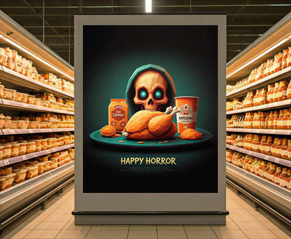 Промпт3: Create an image of promotional materials for 'Happy Horror'. Special chicken food packaging with low-poly 3D illustrations of chickens and farm elements, using orange and turquoise accents. Include the tagline: 'Where the Chickens are Scary Good! ' Primary Colors: Orange (#FFA500) and Dark Turquoise (#00CED1). Accent Colors: Black (#000000) and Dark Gray (#333333).