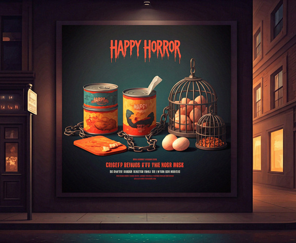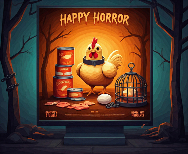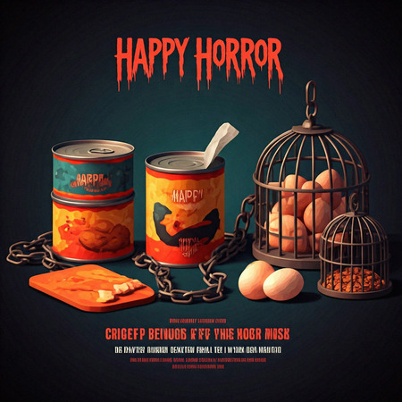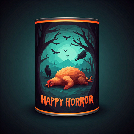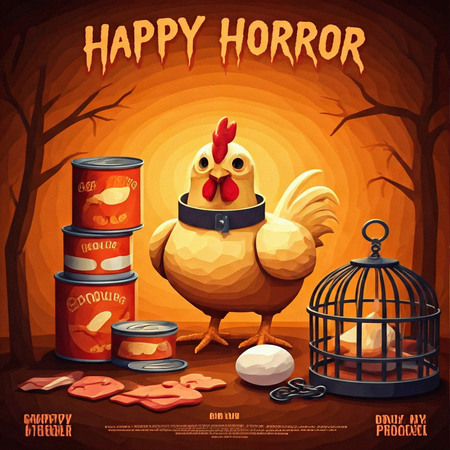 Промпт 1: Create an image of promotional materials for 'Happy Horror'. Canned chicken stew packaging with low-poly 3D illustrations of chickens and farm elements, using orange and turquoise accents. Include the tagline: 'Where the Chickens are Scary Good! ' Primary Colors: Orange (#FFA500) and Dark Turquoise (#00CED1). Accent Colors: Black (#000000) and Dark Gray (#333333).