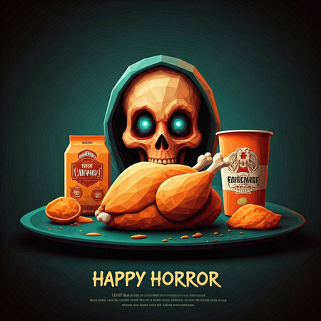 Промпт: Create a picture of horror-style low-poly poster for the brand 'Happy Horror', promoting their chicken-based products. Use the low-poly 3D cartoon horror aesthetic and the brand’s signature colors: orange (#FFA500) and dark turquoise (#00CED1), with black and dark gray accents for a spooky yet playful vibe.