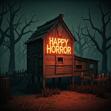 Промпт 1: Visualize the physical space of the chicken farm in a low-poly 3D style, branded as «Happy Horror». A spooky yet charming chicken coop made of weathered wood with a glowing orange sign that says 'Happy Horror». Primary Colors: Orange (#FFA500) and Dark Turquoise (#00CED1).