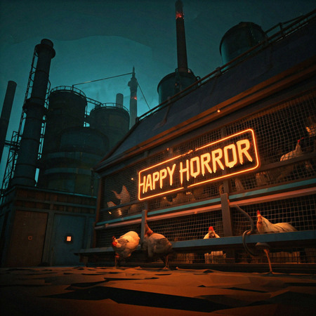 Промпт 2: Visualize the physical space of the chicken farm in a low-poly 3D style, branded as «Happy Horror» A spooky chicken factory with a glowing orange sign that says «Happy Horror». Primary Colors: Orange (#FFA500) and Dark Turquoise (#00CED1).
