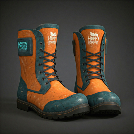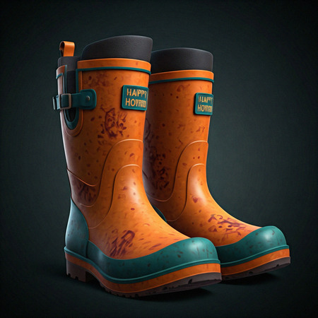 Промпт: Create a picture of branded chicken farm boots representing 'Happy Horror'. Don’t generate people, just farm boots. Farm boots should be with the name of the brand on it.