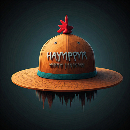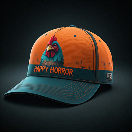 Промпт: Create a picture of branded chicken farm hat representing 'Happy Horror'. Don’t generate people, just farm hat. A farm hat should be with the name of the brand on it.