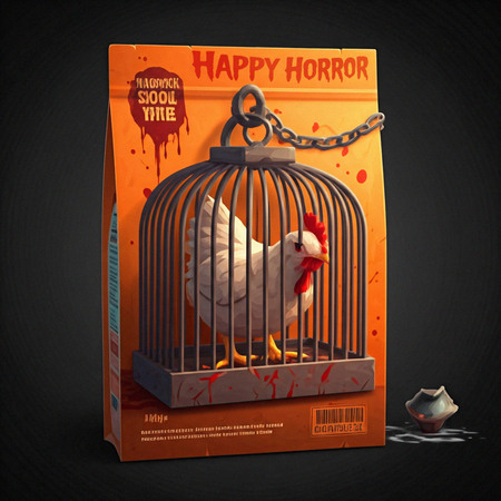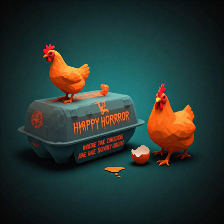 Промпт1: Create an image of promotional materials for 'Happy Horror'. Chicken cage packaging with low-poly 3D illustrations of chickens and farm elements, using orange and turquoise accents. Include the tagline: 'Where the Chickens are Scary Good! ' Primary Colors: Orange (#FFA500) and Dark Turquoise (#00CED1). Accent Colors: Black (#000000) and Dark Gray (#333333).