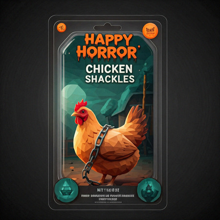 Промпт2: Create an image of promotional materials for 'Happy Horror'. Chicken shackles packaging with low-poly 3D illustrations of chickens and farm elements, using orange and turquoise accents. Include the tagline: 'Where the Chickens are Scary Good! ' Primary Colors: Orange (#FFA500) and Dark Turquoise (#00CED1). Accent Colors: Black (#000000) and Dark Gray (#333333).