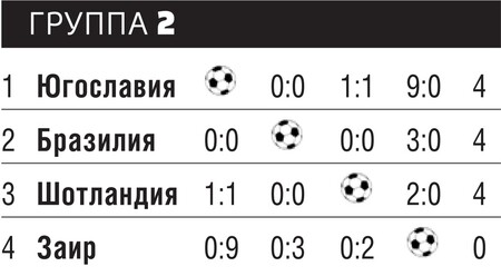 Сборная Заира сыграла важнейшую роль в определении команд, которые продолжат борьбу. В следующий круг вышли те сборные, которым удалось забить в ворота африканцев большее количество мячей. Шотландцы, дважды поразившие ворота сборной Заира в первом туре, остались за бортом. При этом единственный представитель Великобритании в групповом турнире никому не проиграл, став первой в истории командой, выбывшей из розыгрыша с цифрой «0» в графе поражений. В матче с бразильцами шотландцы могли пропустить несколько мячей уже в начале первого тайма, однако блистательно действовал вратарь Харви, отбивший удары Ривелино, Лейвиньи и Мариньо. Наступление бразильцев остановил капитан шотландцев Бремнер, который личным примером увлек команду за собой. Полузащитник бился как лев в единоборствах, стелился в подкатах, успевал страховать партнеров на самых опасных направлениях.