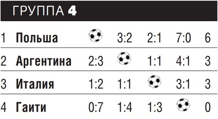 Сборная Польши оказалась единственной командой, не потерявшей ни одного очка в групповом турнире. Поляки заслужили самых высоких похвал за игру с Аргентиной, кото рая первоначально пыталась сыграть от обороны. Два быстрых гола, забитых Лято и Шармахом к 8-й минуте, вынудили аргентинцев отказаться от избранной стратегии. Ближе к концу встречи южноамериканцы предприняли яростный штурм ворот польской сборной, но блистательно проявил себя голкипер Томашевский. Этот матч был признан одним из лучших на групповой стадии турнира. Поединок с итальянцами Аргентина провела не столь эффектно и довольствовалась ничьей. Форварды команды — Кемпес, Ясальде и Айяла — никак не могли наладить взаимопонимание, что отрицательно сказывалось на результативности. Гол в ворота итальянцев забил полузащитник Хаусман, а в матче с аргентинцами один из голов записал на свой счет защитник Эредиа. Итальянская сборная в играх группового турнира выглядела неважно. В команде не чувствовалось единства, нападающие Рива и Ривера были далеко не в лучшей форме, а тренер Валькареджи постоянно тасовал состав.
