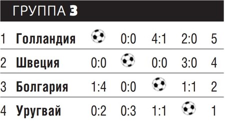 В следующий круг вышли также шведы, начавшие забивать лишь в третьем по счету матче. Дуэт форвардов Эдстрём — Сандберг, на который возлагались особые надежды, молчал на протяжении 226 минут, но в матче с уругвайцами показал, на что способен. Эдстрём дважды поразил ворота соперника, Сандберг отличился один раз. Последнее место двукратных чемпионов мира из Уругвая лишь подчеркнуло кризисное состояние футбола в стране.