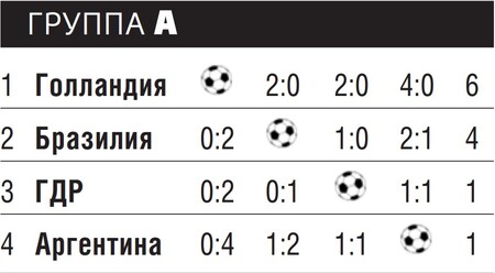 Бразильцы продвигались вперед не столь убедительно. Сначала им с большим трудом удалось обыграть сборную ГДР, затем с минимальным перевесом была одержана победа над аргентинцами. В результате, перед очной встречей фавориты имели одинаковое количество очков. Несмотря на то, что голландцы выиграли и этот поединок с убедительным счетом 2:0, бразильцы долгое время успешно сопротивлялись их натиску. В первом тайме они сумели противопоставить наступательному порыву голландцев мощную, цепкую, задиристую игру с острыми выпадами и контролем над центром поля. Провести в таком же темпе вторую половину встречи действующим чемпионам мира не хватило сил.
