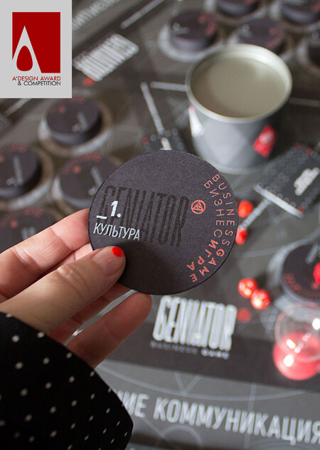 Все элементы айдентики Geniator, дизайн логотипа, игрового поля, карточек с вербальной и визуальной информацией — это отражение методической основы но в метафорической ассоциативной форме. Все вместе они создают пространство с навигацией, системой управления в виде карточек, кубика, каунтеров, песочных часов и чашей ресурсов. Взаимодействуя по правилам игры, которая заставляет выходить участников из профессиональных рамок и смотреть на задачу творчески, игра создаёт в конечном счёте пространство принятия решений.