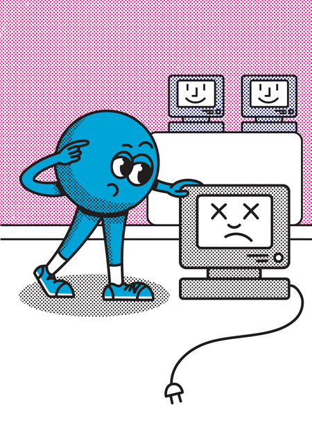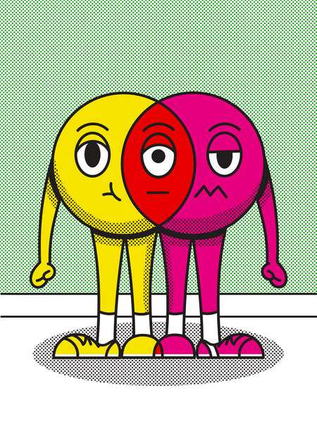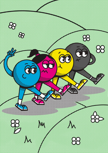 Цвета проекта взяты из модели CMYK. А используемая заливка халфтон отсылает к классической полиграфии, придавая иллюстрациям текстуру и чувство «отпечатанности».