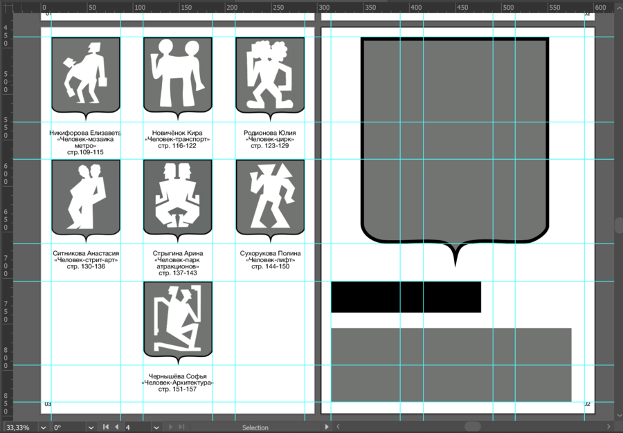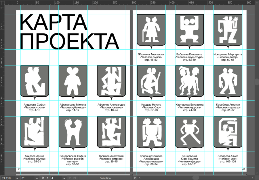 В рамках данного студенческого проекта я выполняла функцию куратора групповой работы, координируя процессы и обеспечивая целостность итогового результата. Совместно с командой был осуществлён масштабный этап оцифровки художественных работ, в ходе которого я лично обработала более ста сканов, приведя их к единому визуальному и техническому стандарту. Кроме того, мной были предоставлены группе структурированные мокапы используеммые для визуализации зина в нашей групповой работе.