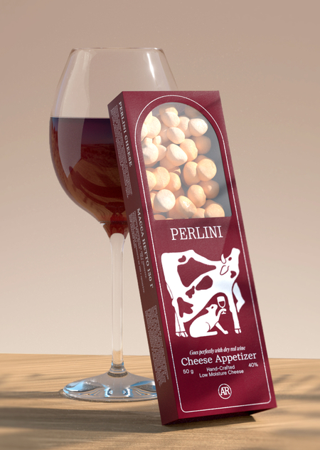 The series includes several packaging formats adapted to different types of cheese snacks (Perlini, Bocconcini, Burrata, Skamorza), while maintaining a unified visual and structural language across the range. The primary material is high-density designer cardboard with a matte lamination, which provides a premium tactile feel and ensures structural stability. Die-cut elements with transparent PET windows are used in selected formats, allowing partial visibility of the product and reinforcing consumer trust through visual transparency.