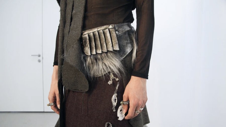Каждый элемент костюма носит уникальный функционал: сумка служит местом хранения палочек для игры, которые есть у каждого перформера. Обвес дополняет звуковую партитуру артистов, а ткань определяет пластику движений.