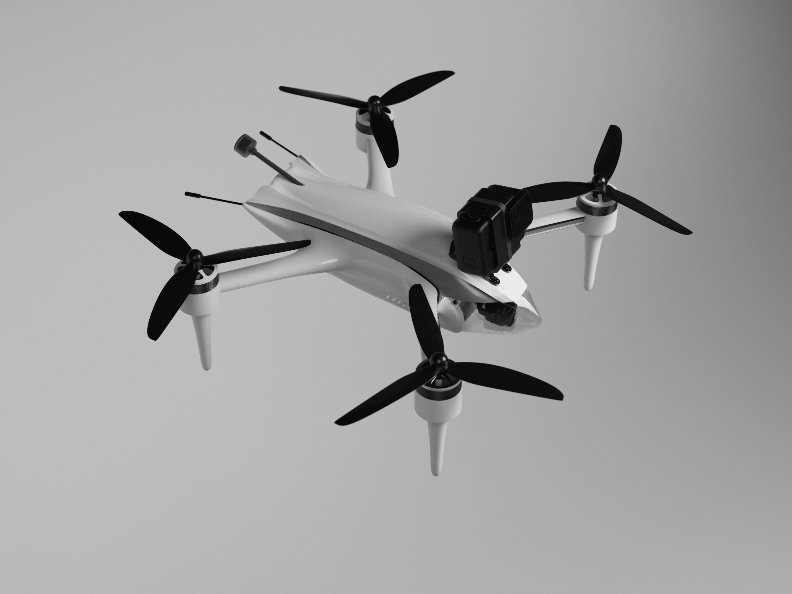 Исследование: Проведен анализ существующих FPV-дронов, выявлены особенности конструкции, эргономики и управления. Определены ключевые характеристики, важные как для цифровой модели, так и для возможной физической сборки.