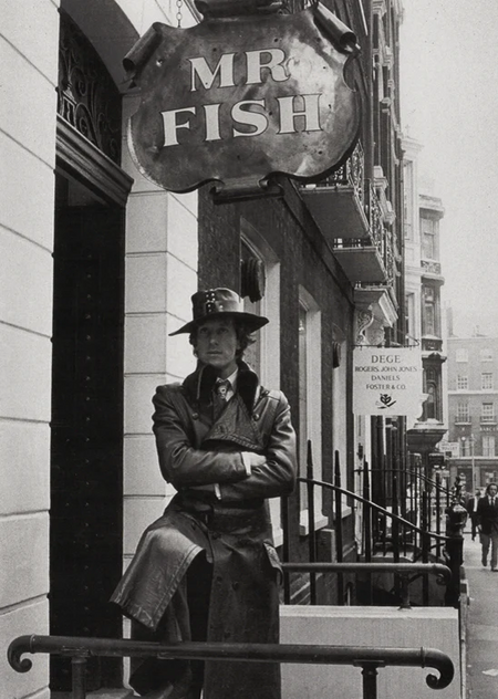 «Майкл Фиш у бутика Mr Fish Клиффорд Street, Мэйфэр (1969)» | «Майкл Фиш: лидер Павлиньей революции (1970)».