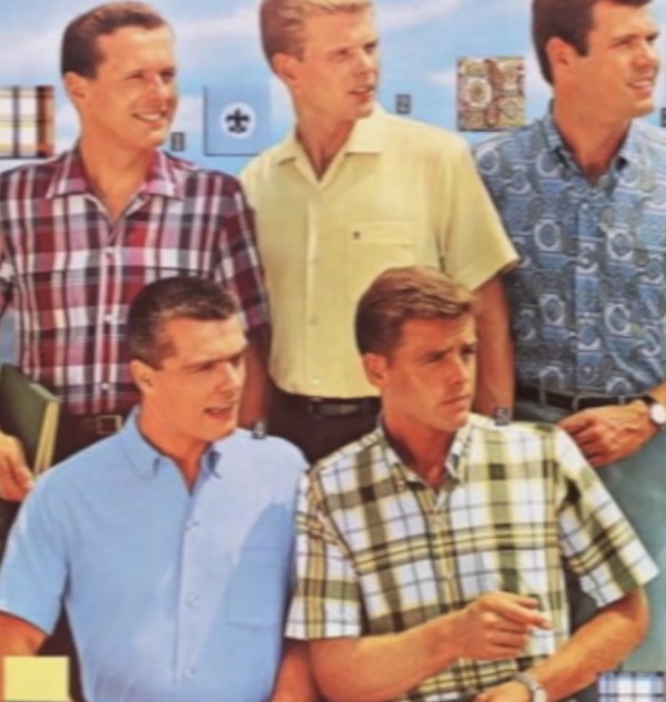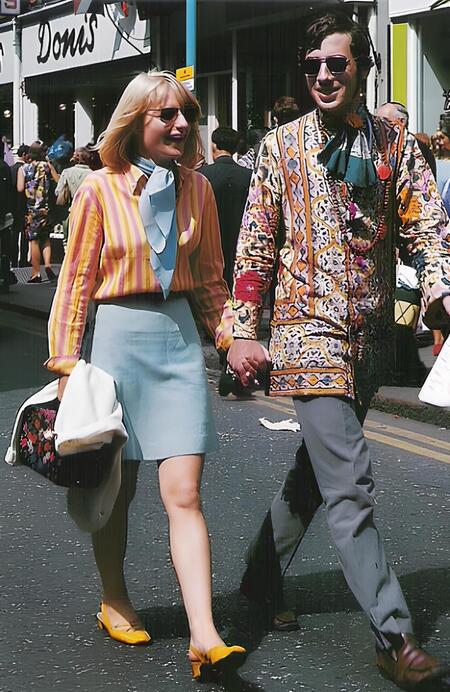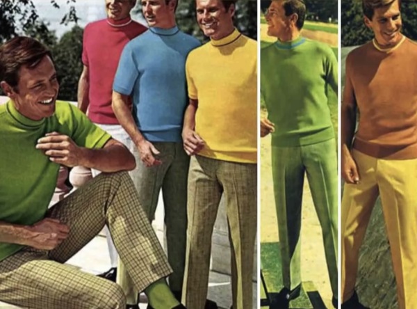 Если ранее мужская мода была сдержанной, с доминированием тёмных и нейтральных тонов, то в 60-е годы произошёл резкий отход от этой традиции. Яркие, насыщенные цвета — от кислотных желтых и оранжевых до насыщенных синих, красных и зелёных — стали ключевыми элементами гардероба. Они использовались не только в отдельных деталях, но и в целых ансамблях, создавая эффект визуальной смелости и театральности.