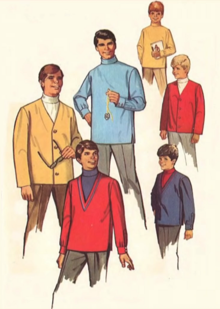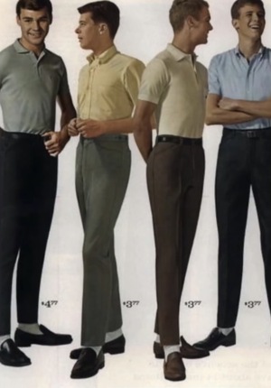 Особое внимание уделялось принтам и узорам. В моде оказались клетка, полоска, «елочка», а также сложные геометрические мотивы, вдохновлённые поп-артом и психоделической эстетикой. Позднее, с развитием хиппи-культуры, в мужской гардероб вошли психоделичные флоральные и пейсли-узоры, мотивы, заимствованные из восточных, африканских и индийских культур.