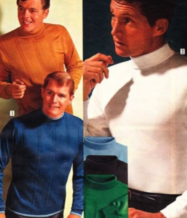 Мужская мода 70-х стала еще более смелой и яркой. Основной акцент делался на стройную фигуру: водолазки, облегающие рубашки и брюки с широкими массивными ремнями, благодаря которым торс выглядел более вытянутым.