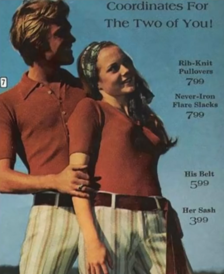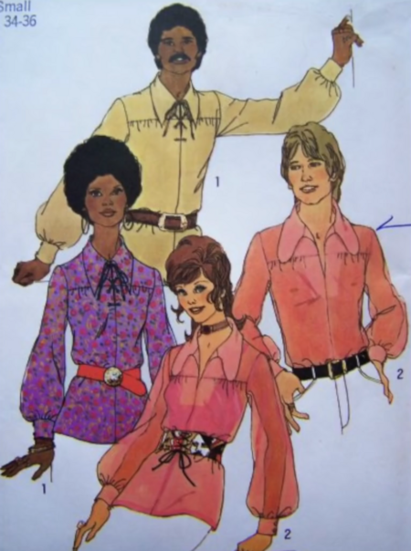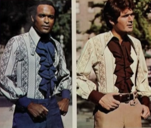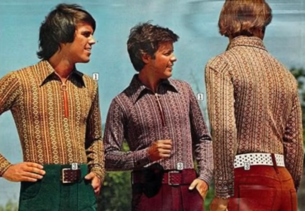 В 70-е мода стала более гендерно нейтральной. Джинсы, рубашки, свитеры носили и мужчины, и женщины. Появились новые узоры для рубашек, вдохновленные романтическими стилями прошлых эпох. Бархат, шелк, шифон — материалы, ранее ассоциировавшиеся с женской одеждой, теперь активно использовались мужчинами.