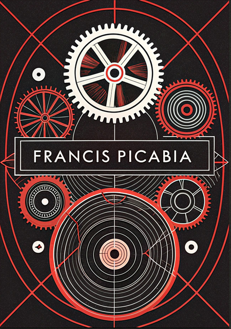 5)Francis Picabia poster: overlapping gears, thin red lines, geometric circles, layered transparencies, solid matte black background, white text „FRANCIS PICABIA“ centered at bottom, Singo Sans Rounded font, bold style.