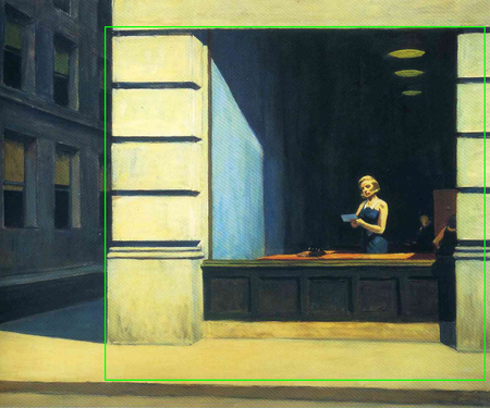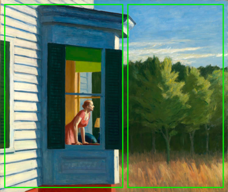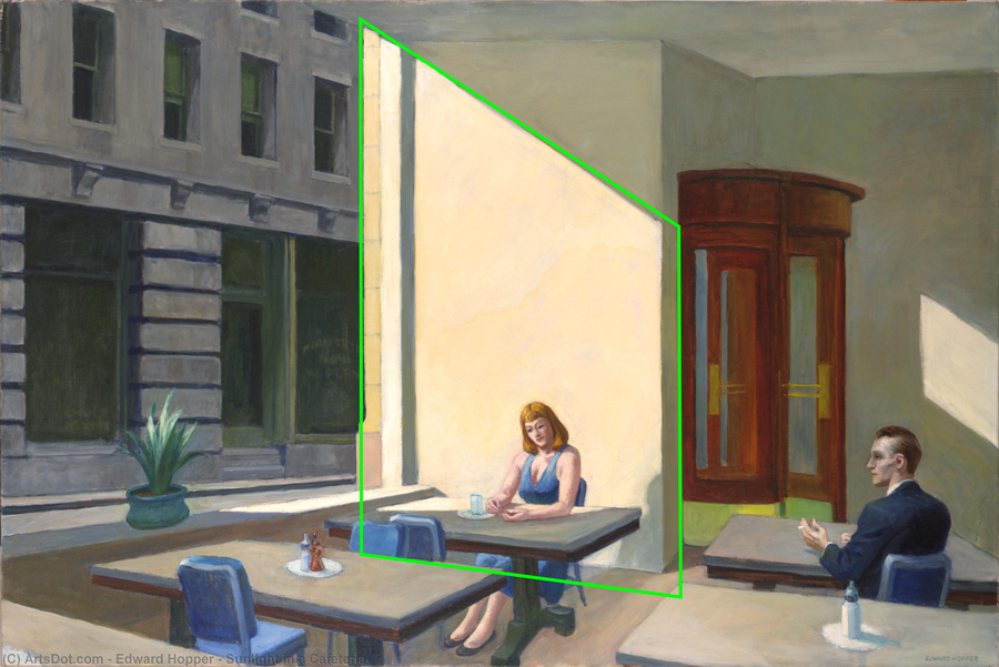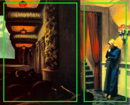 Говоря о создании пустоты, художник прибегает к фрагментированию своих героев, изолируя их от общего мира, отчего ощущение одиночества усиливается. Мы видим разные пространства на одном полотне: коридор и зрительный зал кинотеатра («Нью-Йоркское кино»), кафе и пустынную улицу («Полуночники»), эркер дома и лес («Утро на Кейп-Код»), что создает некий эффект саспенса: предоставляя больший обзор, мы ожидаем, что получим больше информации о происходящем.