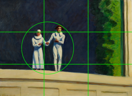 Часто на полотнах Хоппера персонажи играют незначительную по масштабу роль — художник практически всегда оставляет либо половину, либо треть пространства, не задействованных людьми. Эти пустоты часто представляют собой интерьер комнат, небо, окно, природу вокруг. Сами персонажи визуально расположены по правилу третей, и их незначительное место на картине сужает их в контексте героя как личности: часто они воспринимаются как нечто отстраненное, не имеющего своей яркой индивидуальности, а фон преобладает или поглощает героя. Для этой цели Хоппер выбирает горизонтальный формат для создания ощущения преобладания пространства.