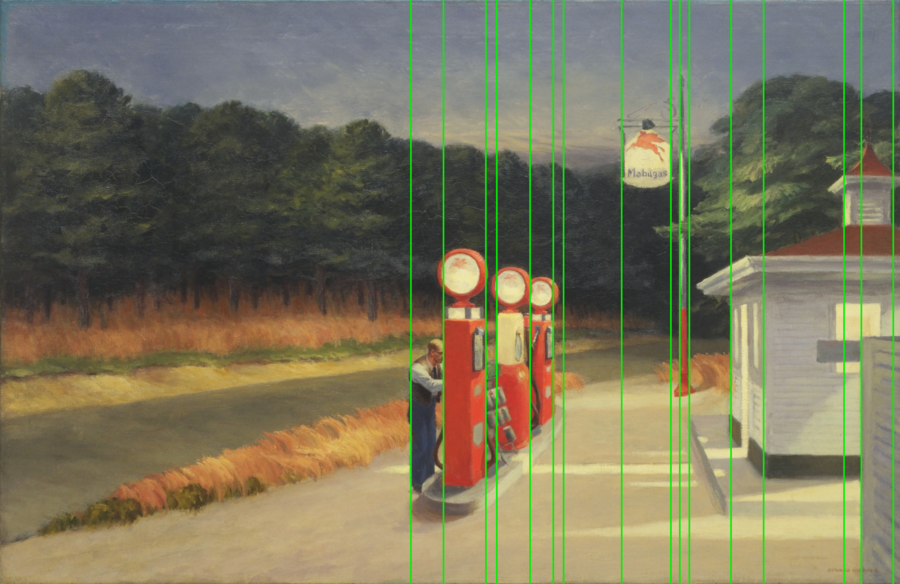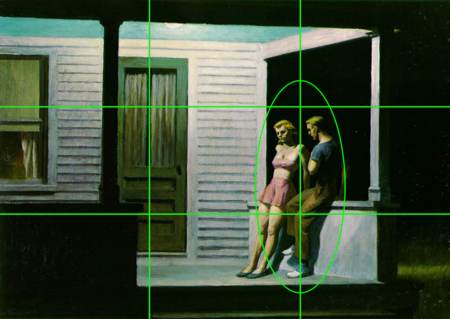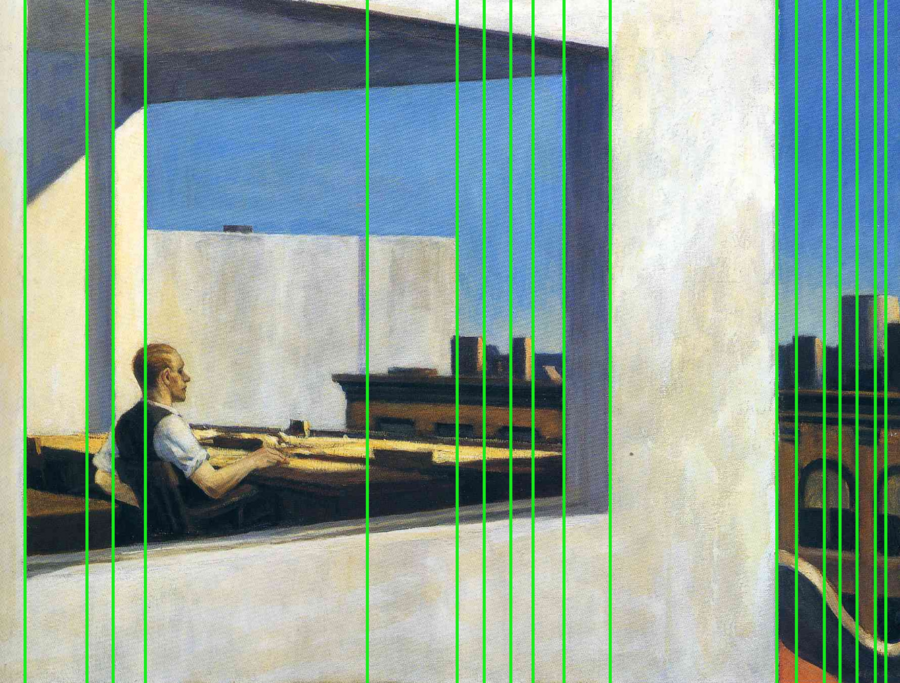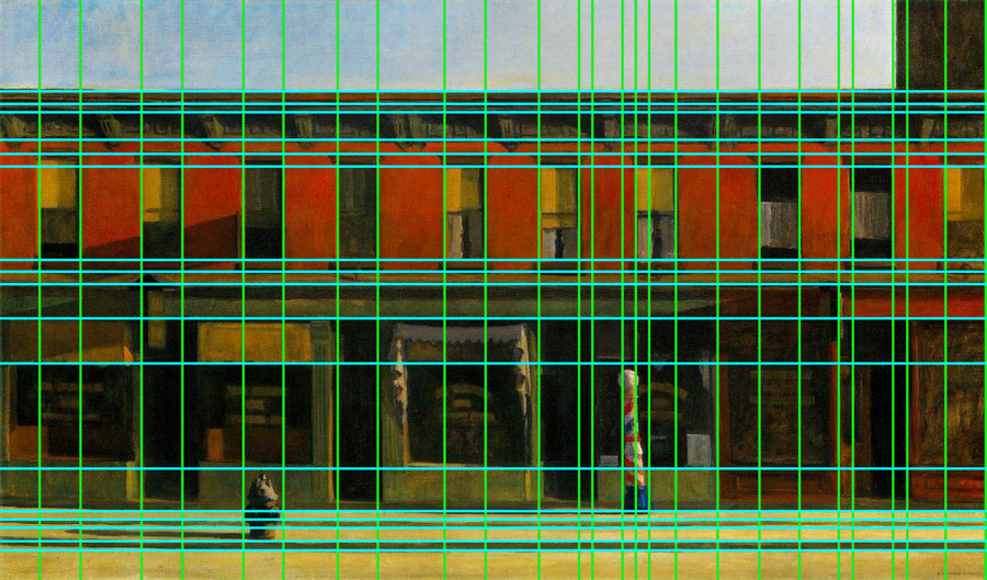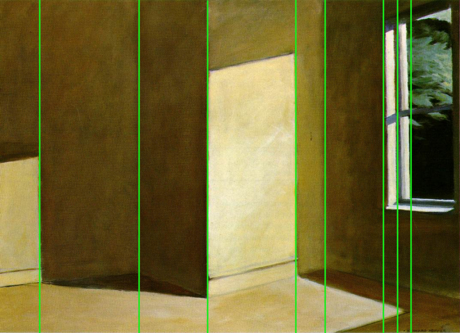 Главным ответом на этот вопрос служит ритм: его очень много в визуальном мире Хоппера. В основном, присутствует ритм вертикалей: часто единообразие линий создают окна вместе с углами комнат и отбрасываемыми тенями («Солнце в пустой комнате»), колонки в ряд, фонарь и углы магазина на «Заправочной станции», окна и угол офиса соотносится с вертикалями окон на заднем плане («Офис в маленьком городе»). Этот прием позволяет лаконично и минималистично поддерживать композицию вне зависимости от ее наполнения.