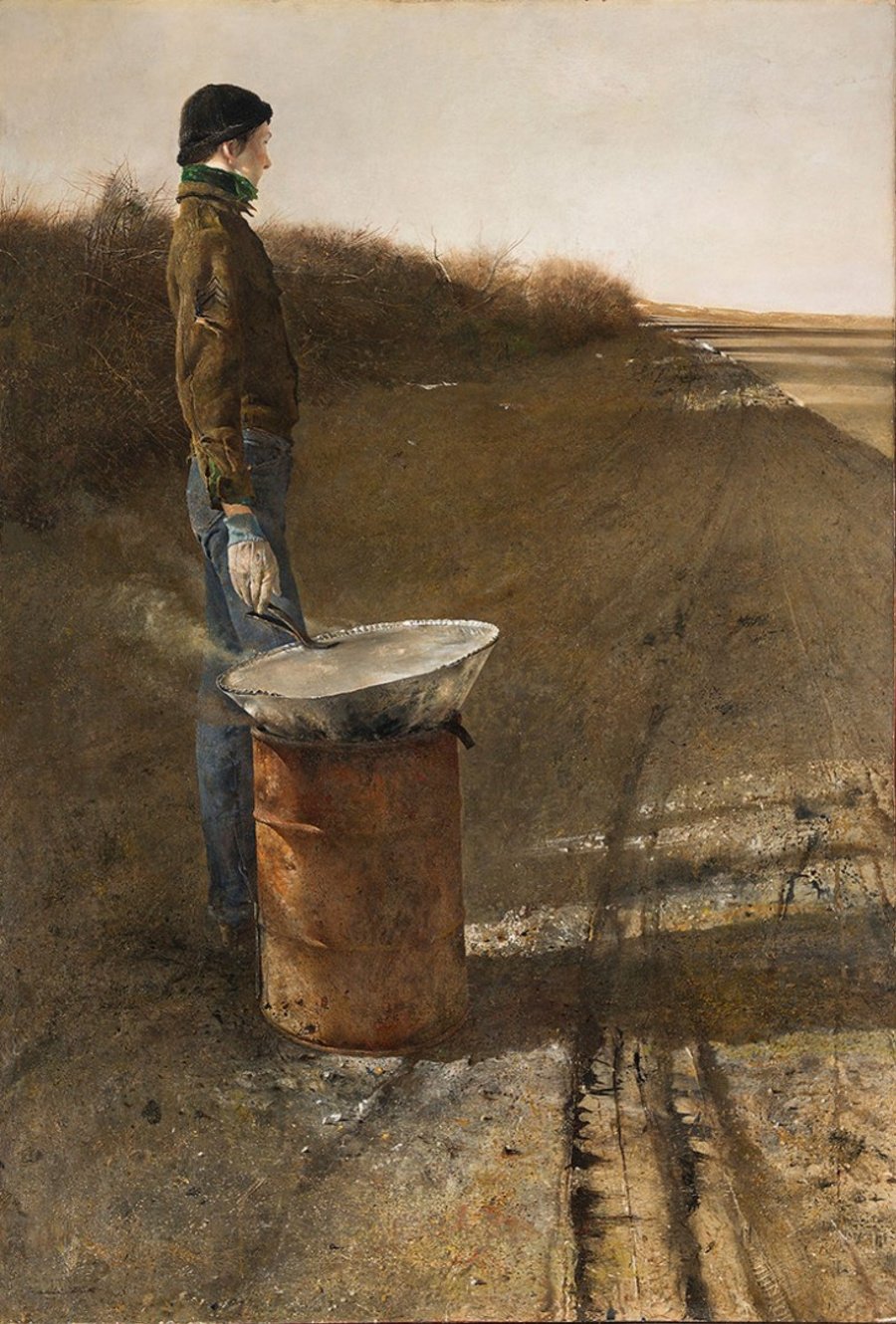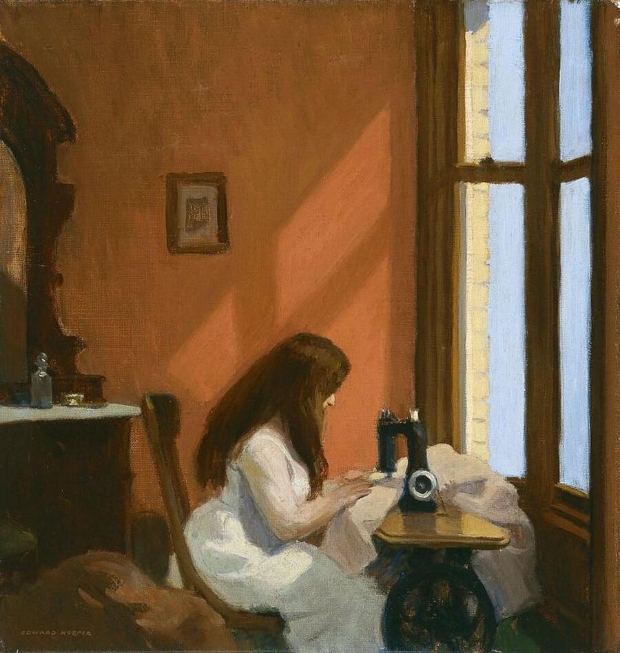 По порядку: Эдвард Хоппер, «Воскресенье», 1926 г.; Эндрю Уайет, «Зима 1946 г.», 1946 г.; Эдвард Хоппер, «Девушка за швейной машиной», 1921 г.; Эндрю Уайет, «Жареные каштаны», 1956 г.