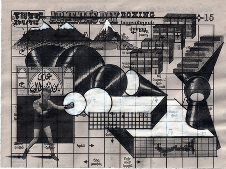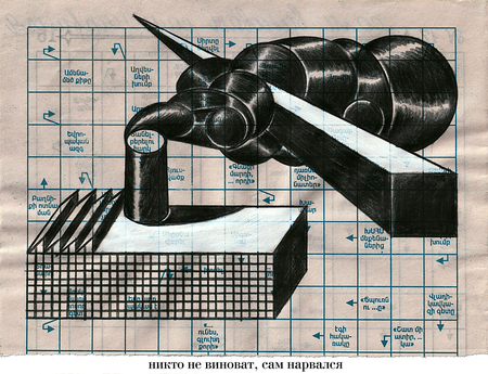 Мы вновь имеем дело с миксом нескольких культурных, исторических и локальных паттернов. Квадраты проёмов заброшенного советского пансионата апеллируют к традициям оп-арта 1970-х и накладываются на элементы голландской инфографики 1950-х, дополненные волнами озера Севан. Удивительно, но на вытканном хлопковыми нитями с натуральным красителем ковре все эти контексты неоржиданно складываются в большой оммаж великому нью-йоркскому дизайнеру Солу Стейнбергу.