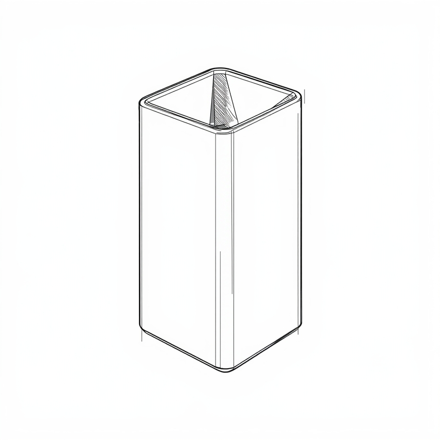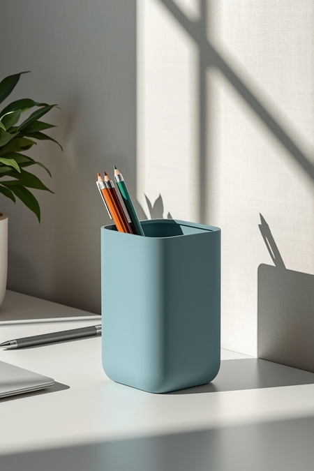 Стакан для ручек с вытянутыми пропорциями и квадратным основанием со скруглёнными углами. Предназначен для хранения письменных принадлежностей.