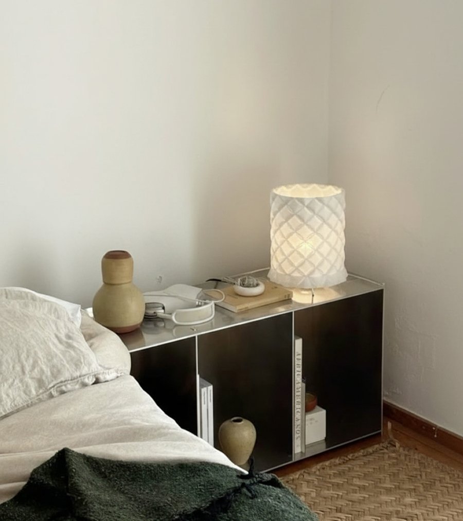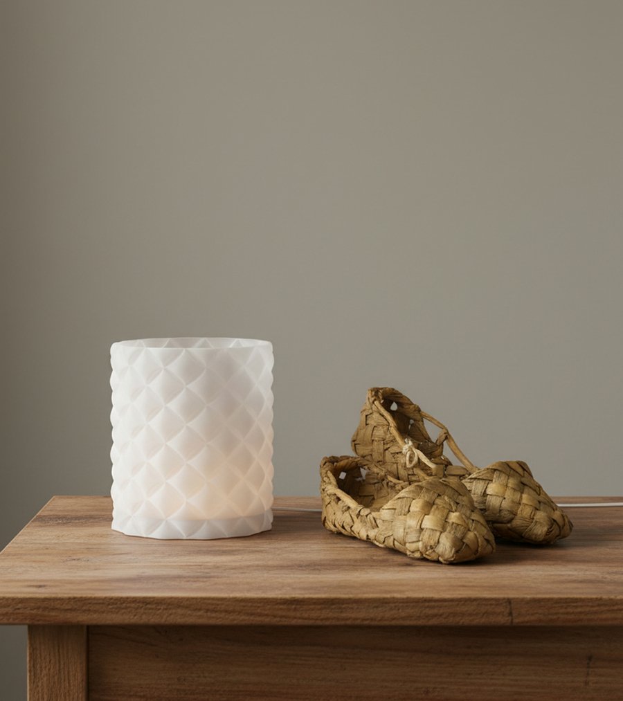 Форма лампы вдохновлена традицией плетения — ремеслом, широко распространённым в сибирских регионах и повседневно присутствовавшим в предметах быта, таких как лапти. Плетёная структура здесь переосмысляется через современный материал и технологию, сохраняя логику переплетения, ритм и тактильность ручного труда.