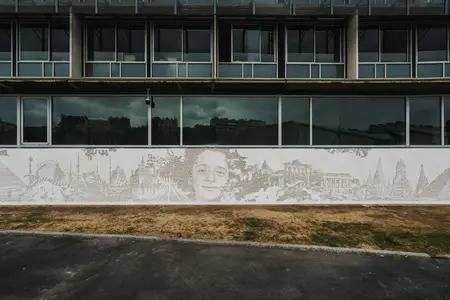 Portuguese artist Alexandre Farto, known as Vhils, works with the city itself as a palimpsest. By carving into weathered walls, he removes layers of accumulated material — posters, paint, plaster — to reveal what lies beneath. The portraits that emerge are inseparable from their substrate: a face takes shape through fragments of old advertisements, traces of graffiti, architectural scars. This is not simply excavation, but a form of temporal choreography where past and present become mutually constitutive.