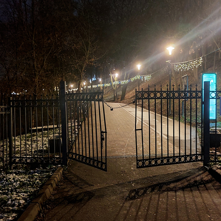Вечером двери парка закрываются на замок — это не мешает посетителям проходить в закрытое пространство парка, они продолжают свой намеченный маршрут через преграду.