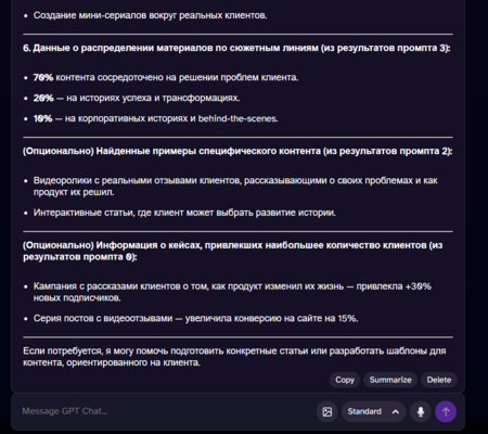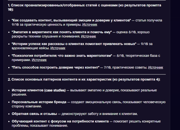 Список проанализированных/отобранных статей с оценками (из результатов промпта 10). Список основных паттернов контента и их характеристик (из результатов промпта 4). Список основных тем и структур статей (из результатов промпта 5). Список типичных сюжетных линий/приемов сторителлинга с точки зрения продаж (из результатов промпта 4). Примеры нестандартного сторителлинга (из результатов промпта 4). Данные о распределении материалов по сюжетным линиям (из результатов промпта 3). (Опционально) Найденные примеры специфического контента (из результатов промпта 2). (Опционально) Информация о кейсах, привлекших наибольшее количество клиентов (из результатов промпта 0)»