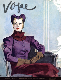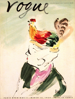 Причудливые шляпы на обложках модного журнала: Vogue January 15, 1936 cover, illustrated by Pierre Mourgue. Vogue March 15, 1938 cover, illustrated by Carl Erickson