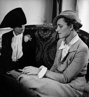 Woman in Minuteman hat, with fashion buyer Mrs. Adam Gimbel, photographed by Roger Schall in the September 1, 1934 Vogue Model wearing duck-bill felt hat, photographed by Horst P. Horst in the August