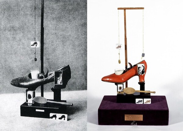 Эта стратегия прямолинейно переходит в модную сферу через шляпу-туфлю Эльзы Скиапарелли (winter 1937–1938), созданную в сотрудничестве с Дали. Скиапарелли придумала ее вместе с художником. Есть версия, что идея подобной шляпы пришла к Скиапарелли от Дали. Художник сфотографировался с ботинком на голове и на плече, а затем сделал из этого объект. Высокий женский туфель, перевёрнутый набок, становится головным убором, вызывая у зрителя шок. Женская голова превращается в пьедестал для демонстрации фитишистского интереса в перестановке и замене одних объектов на другие [25].