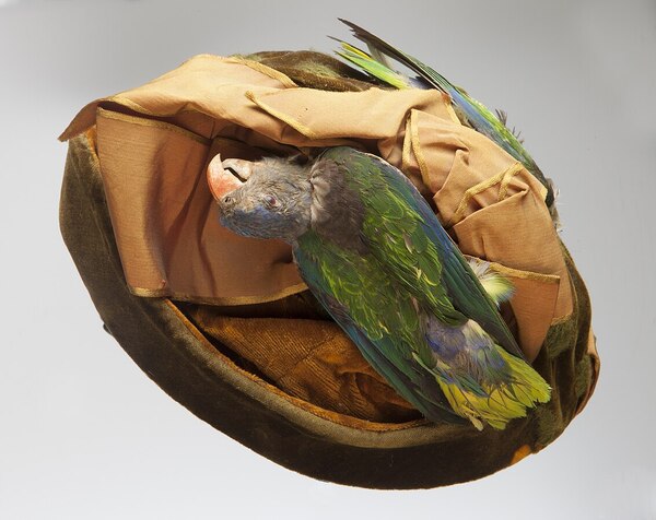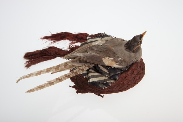 женская шляпа с чучелированной птицей, сидящей «как в гнезде». 1870–1880 Missouri Historical Society (Сент-Луис, США). Хэтти Карнеги, шляпа с двумя птицами, 1940.