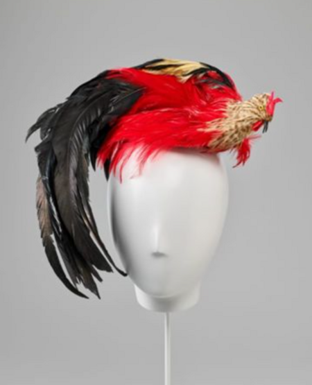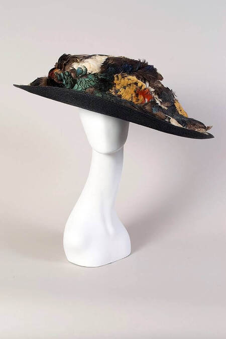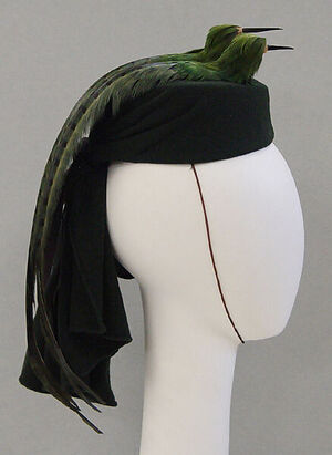 Шляпа 1910 года с фрагментами как минимум трёх самцов разных видов фазанов. музеей Кентского государственного университета. Mlle. Louis, Шляпа.1890 The Metropolitan Museum of Art, Costume Institute.