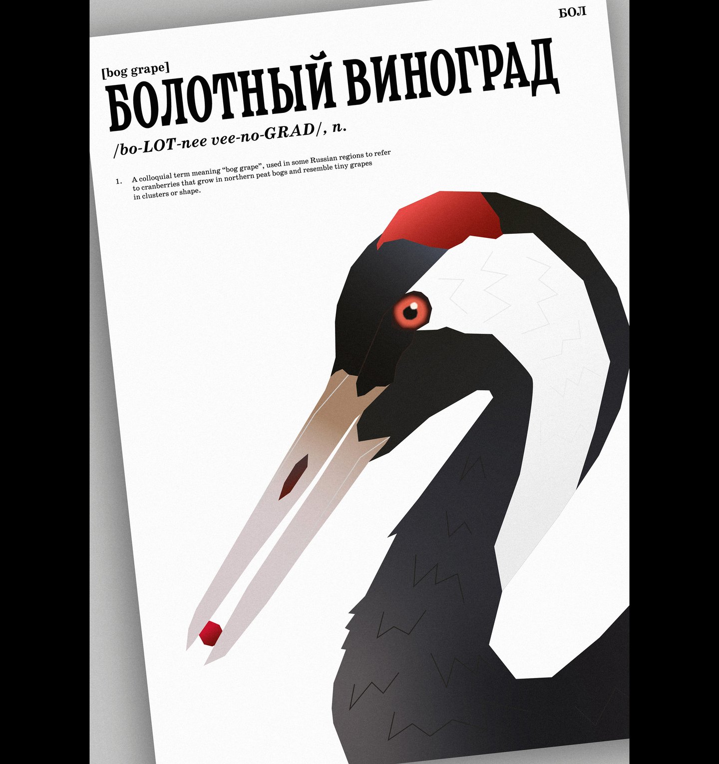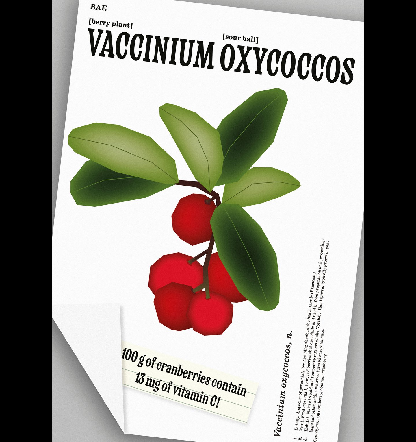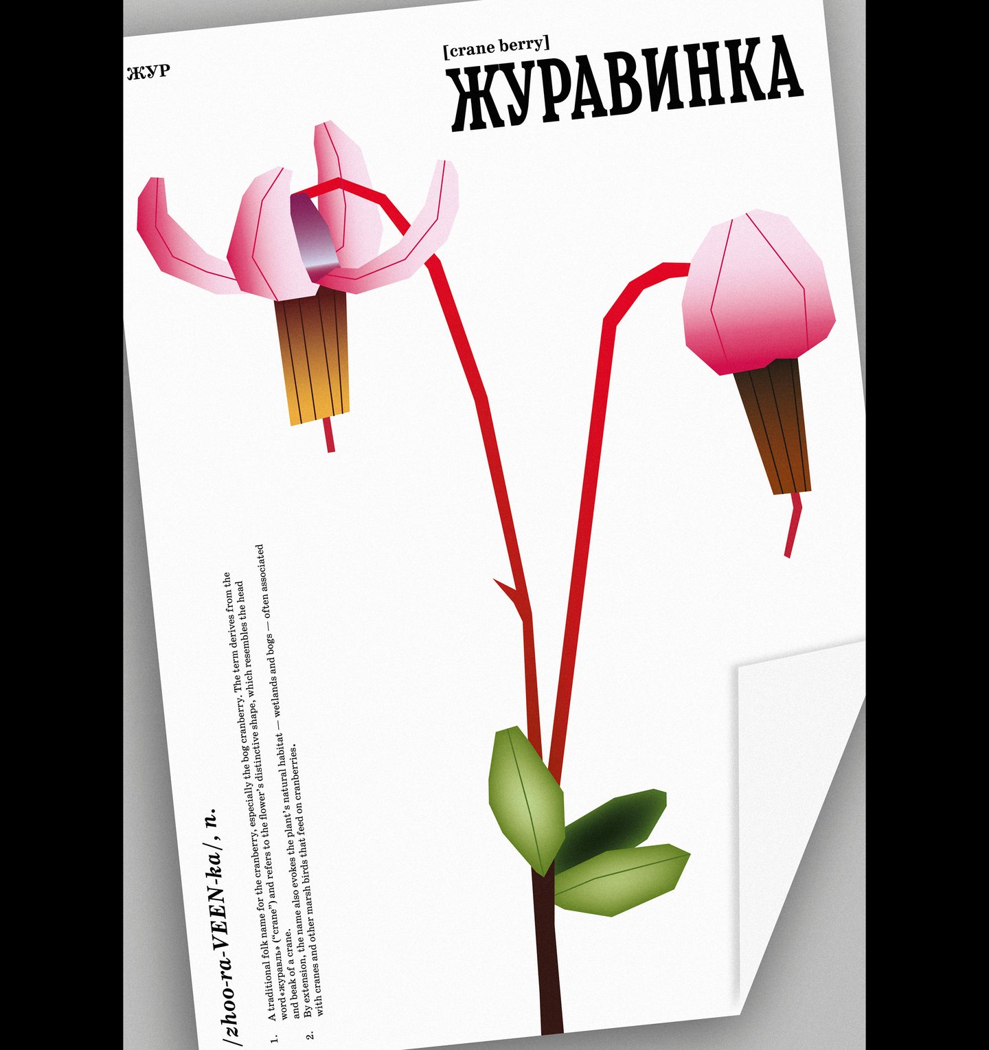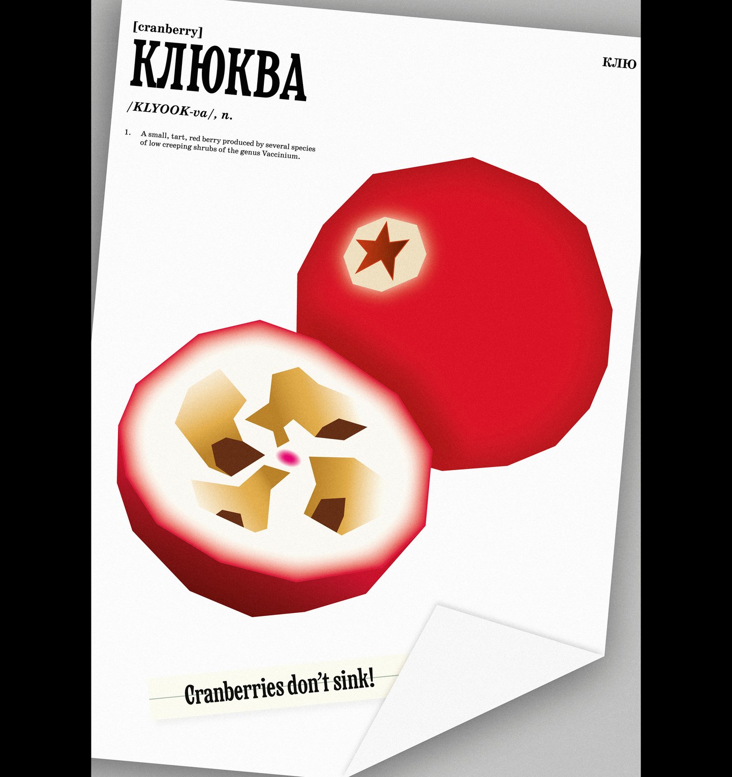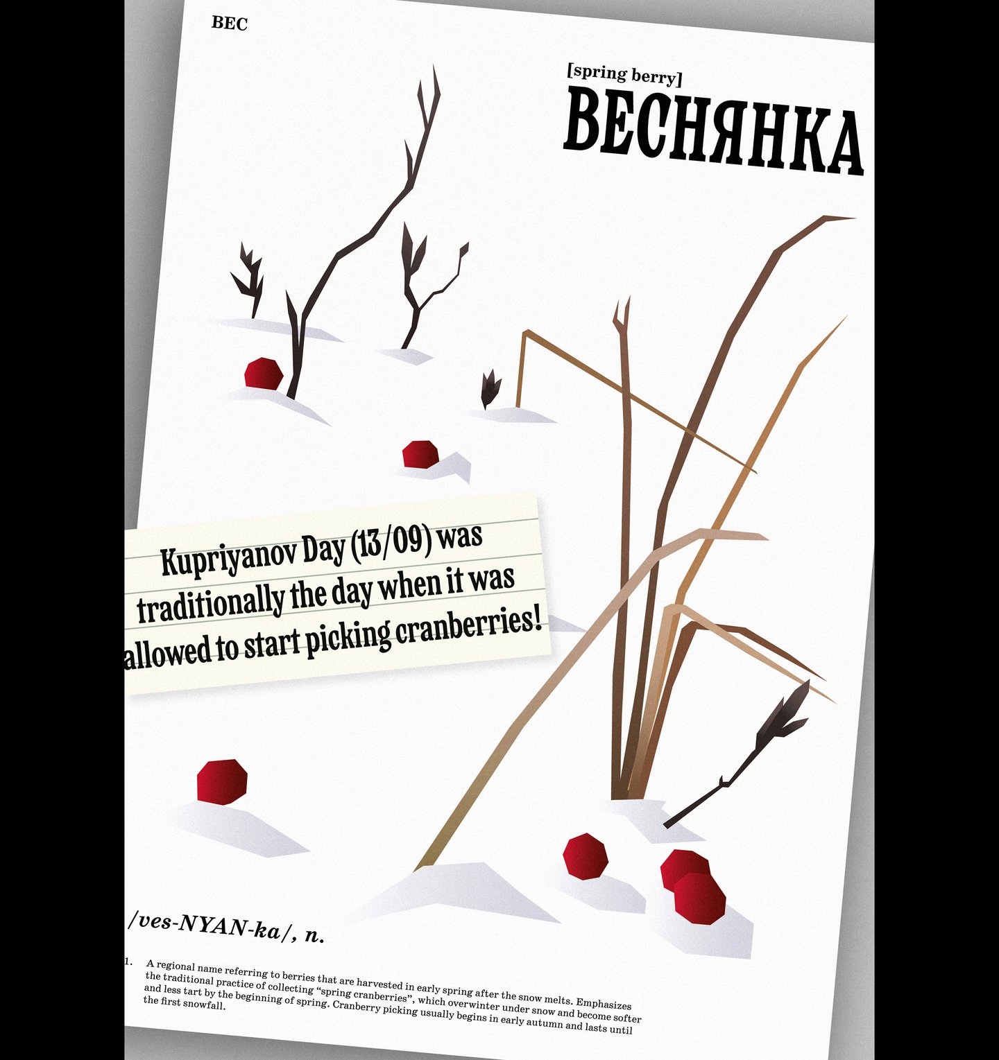 Liron once mentioned that we were going to create a visual dictionary of Russian ingredients. This instantly became a metaphor for my work, as I had found many different folk names for cranberry. Each poster is structured like a dictionary entry, with short academic articles explaining the meanings of the words and an alphabetical index. Initially, the posters resembled pages from a new book, with strict typography and precise illustration placement. However, I realised that our project is about memory, history and culture, so I decided to create the effect of pages torn from a shabby illustrated dictionary and scanned, with notes added.