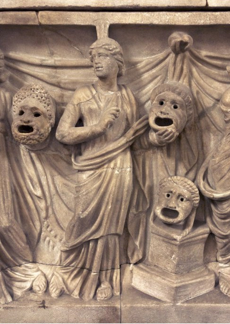 Сюжеты античной трагедии и комедии можно встретить в самых разных произведениях искусства: мозаиках, барельефах, горельефах, вазах, скульптурах.
