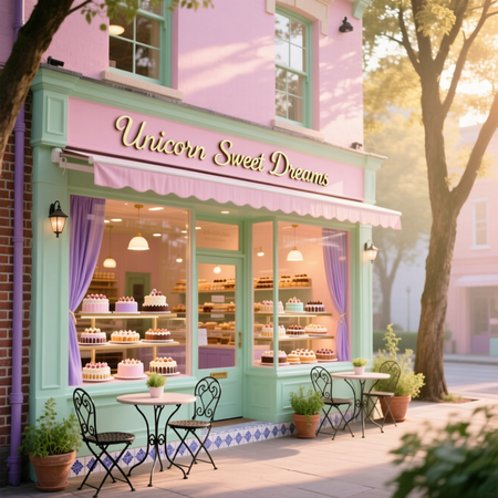 Promts: Beautiful pastry shop. Shot from a distance. Inscription on the Unicorn sweet dreams. Pastry shop. Pastel colors. Realism.