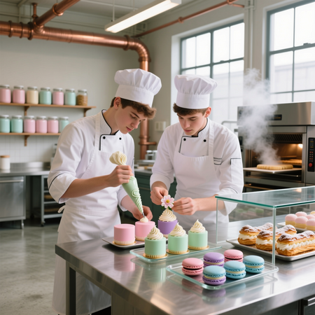 Promts: A production workshop. Desserts. Only pastel colors. Realism. Two guys in their 20s A pastry shop. Production. Desserts. Only pastel colors. Realism. One girl in her 40s.