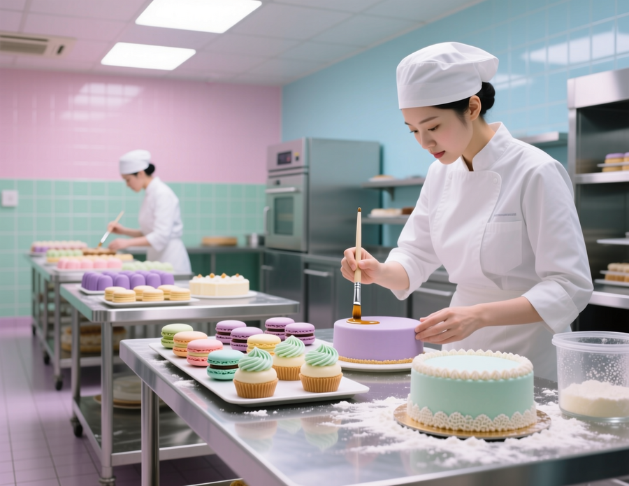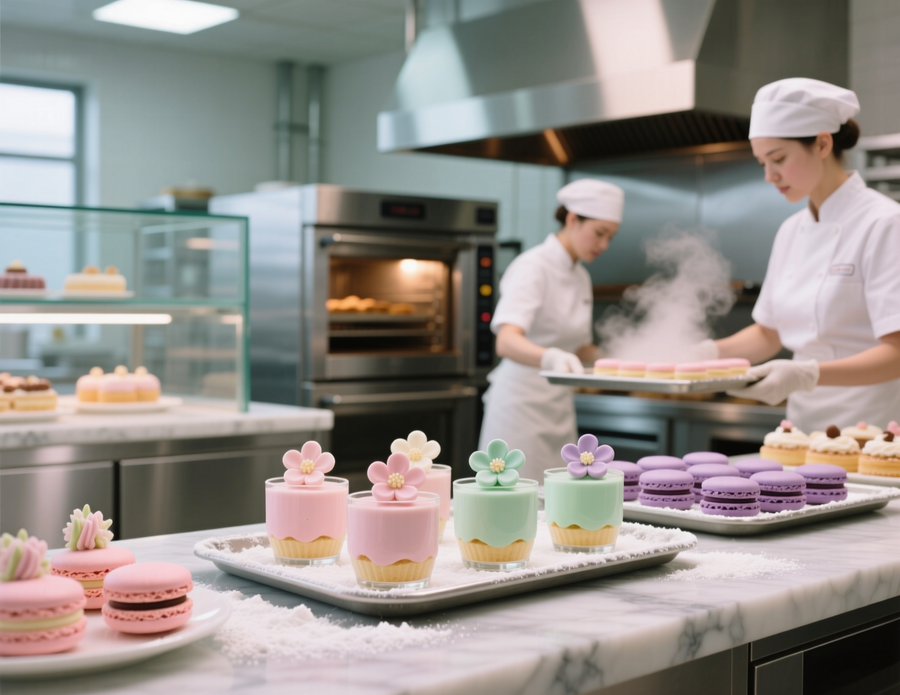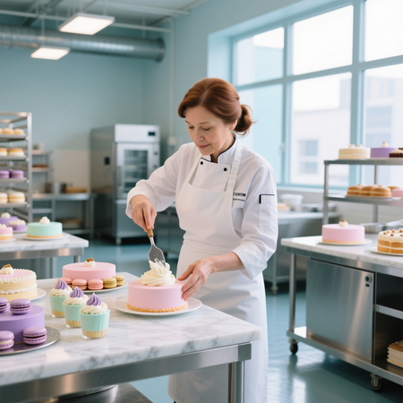 Promts: Confectionery. Pastel colors. Realism. Pastel desserts. Production workshop. A pastry shop. A production workshop. Desserts. Only pastel colors. Realism.