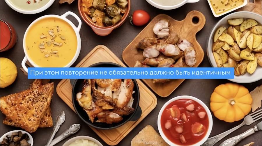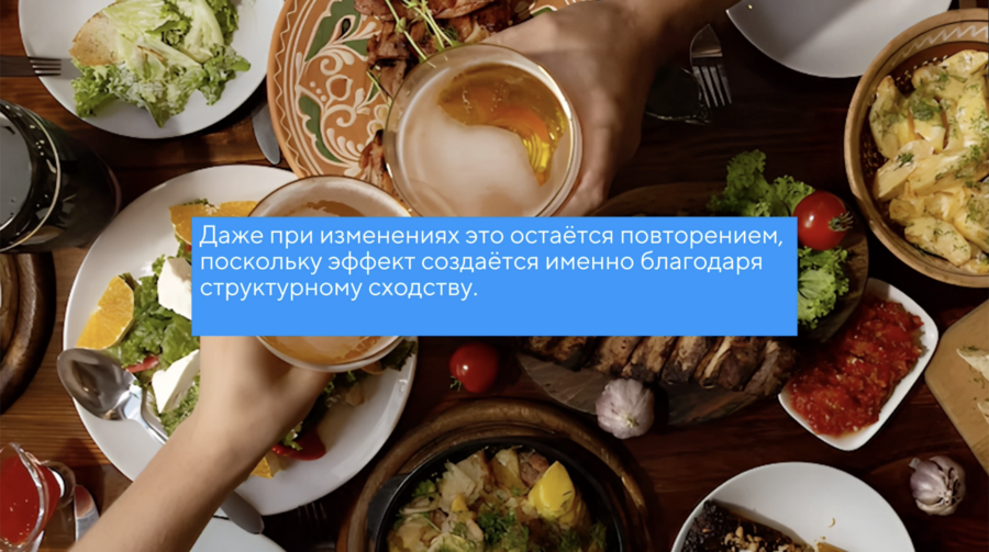 При этом повторение не обязательно должно быть идентичным, какие-то элементы могут пропускаться, заменяться другими. Даже при изменениях это остаётся повторением, поскольку эффект создаётся именно благодаря структурному сходству.